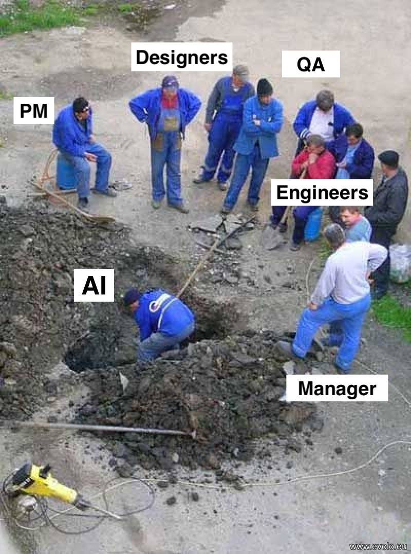 On the other hand, in AI-DLC, AI drafts implementations at every stage: PRD, code, tests, deployment config. Humans review, approve, and provide judgment. You can think of AI as the “worker” in that famous meme below, and humans are those who observe.
