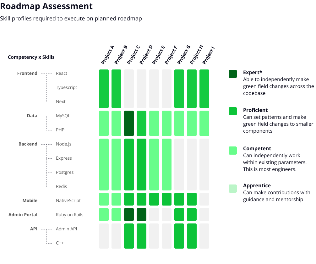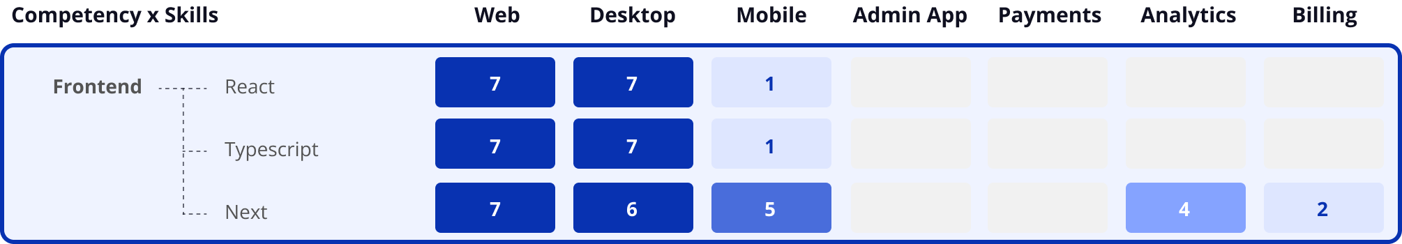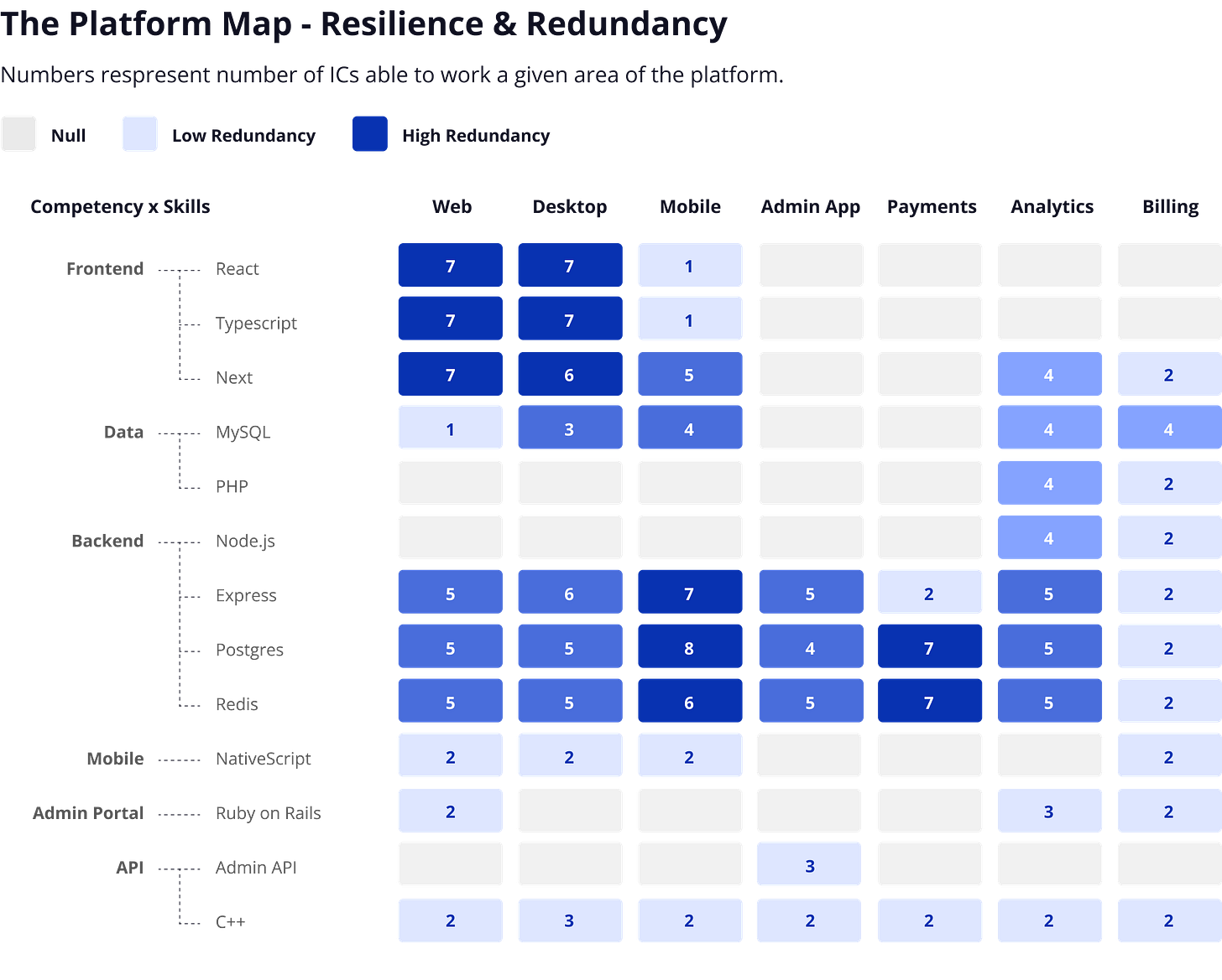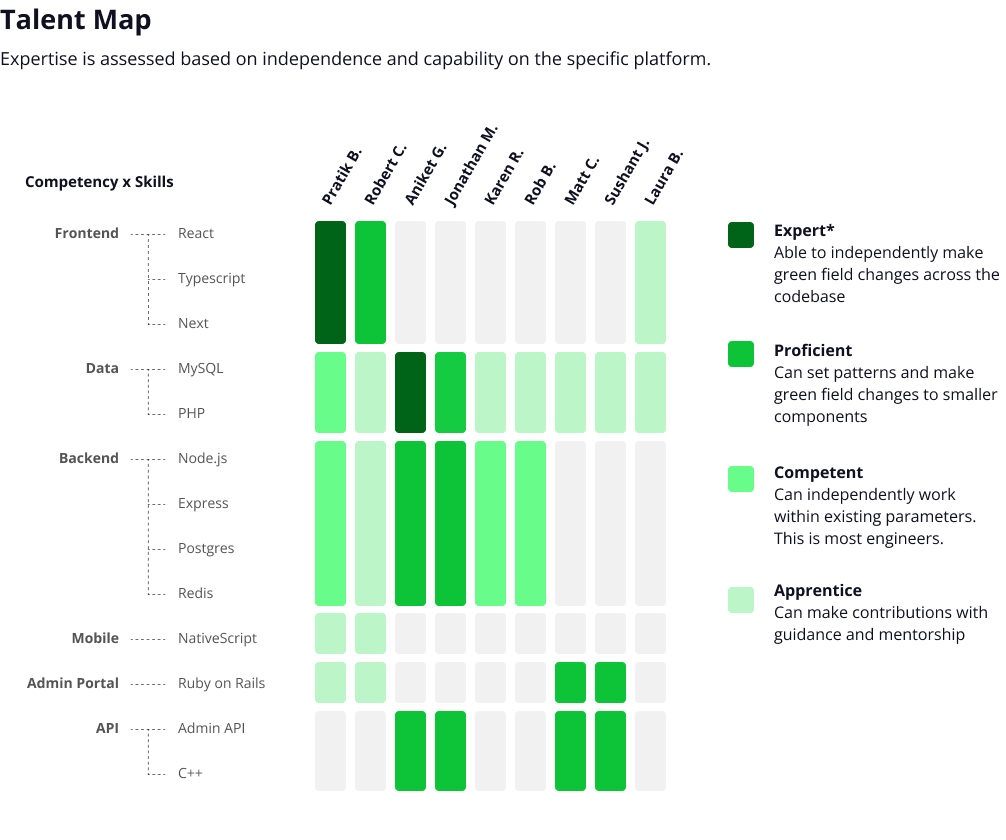 This view is constructed by surveying and understanding the capabilities of the existing team relative to relevant parts of the platform, right now. Ex: we don’t care whether or not someone “is good at frontend” - we care that they know the frontend relative to the platform in question.