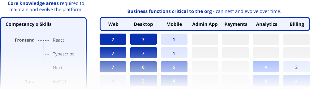 The rows represent different clusters of knowledge required to maintain and evolve the platform. The columns represent core business functions.